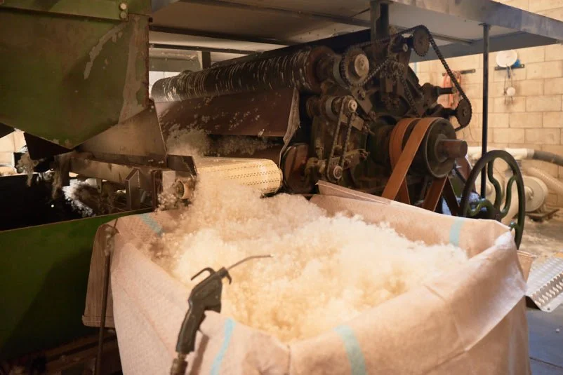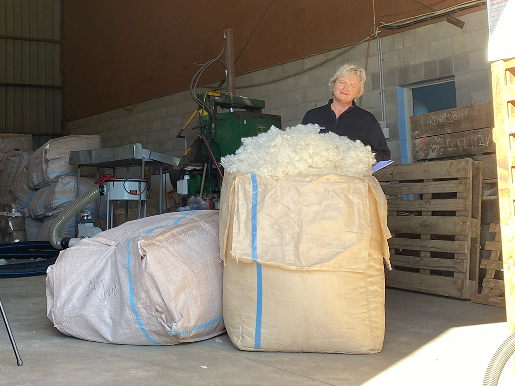 A wool carding machine making WiseFill™ wool knops.