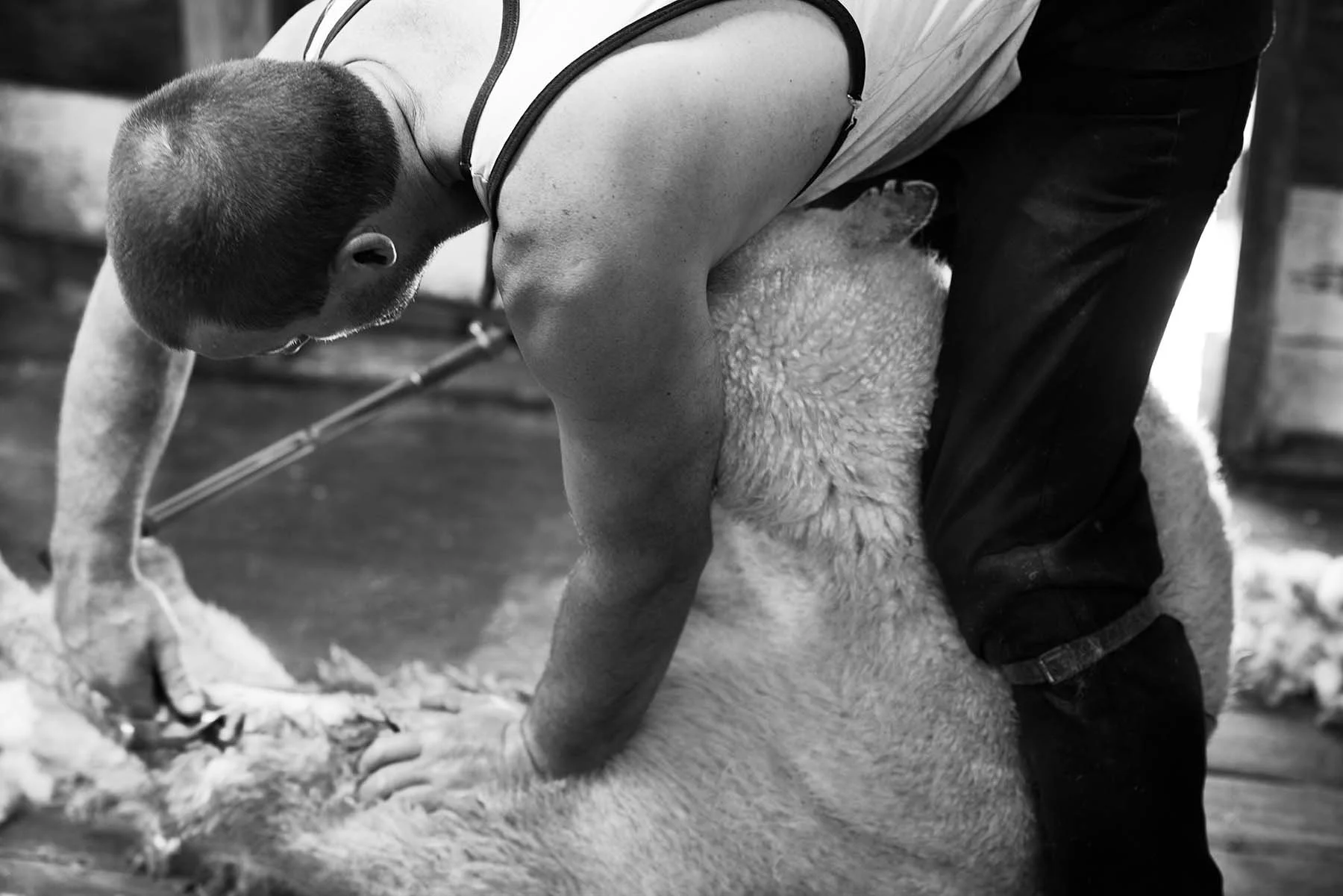 Professionals trained to remove the fleece of wool from a sheep.